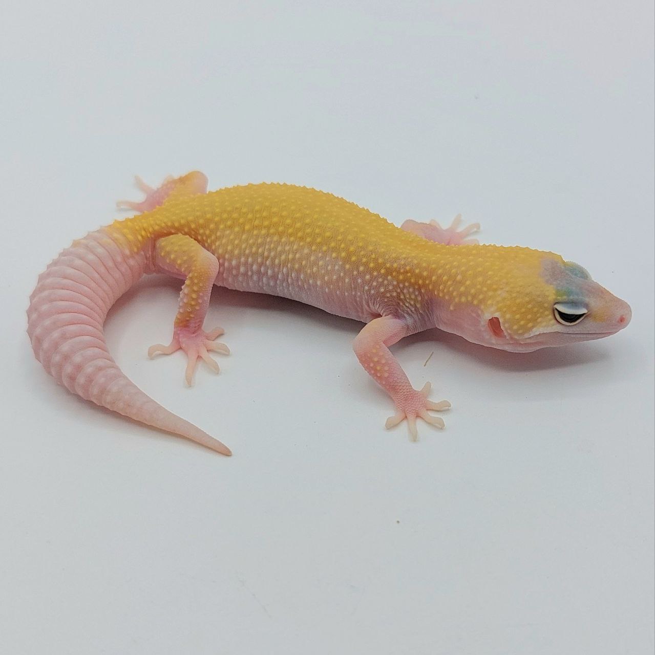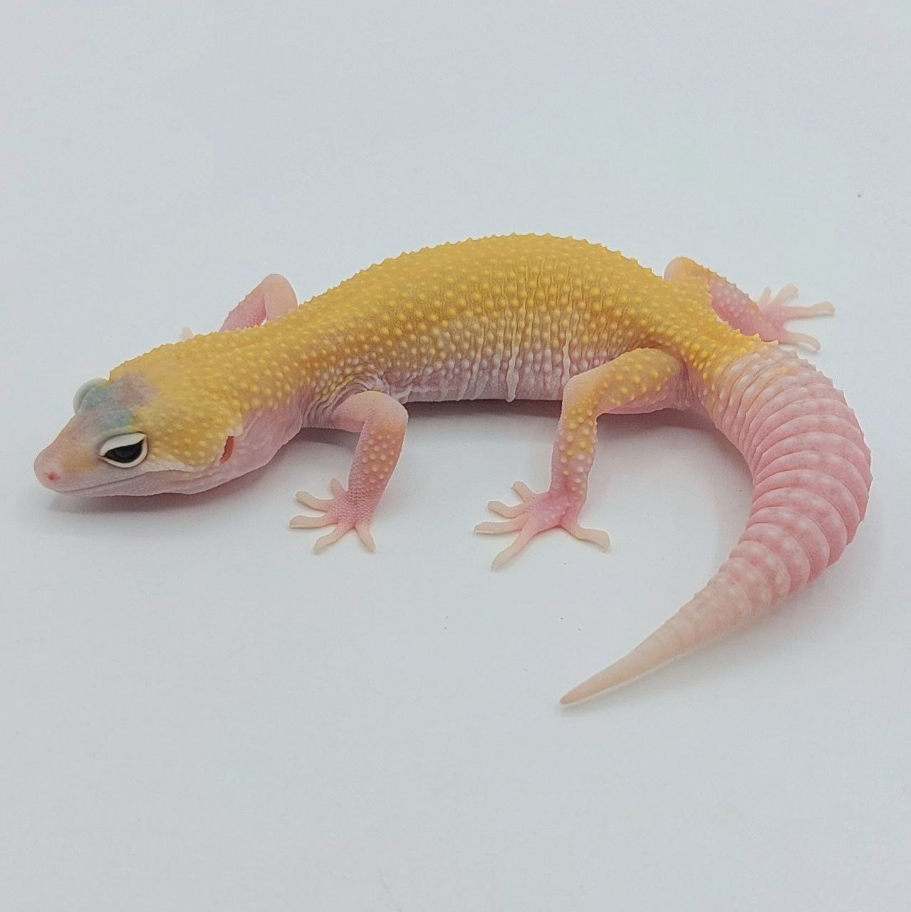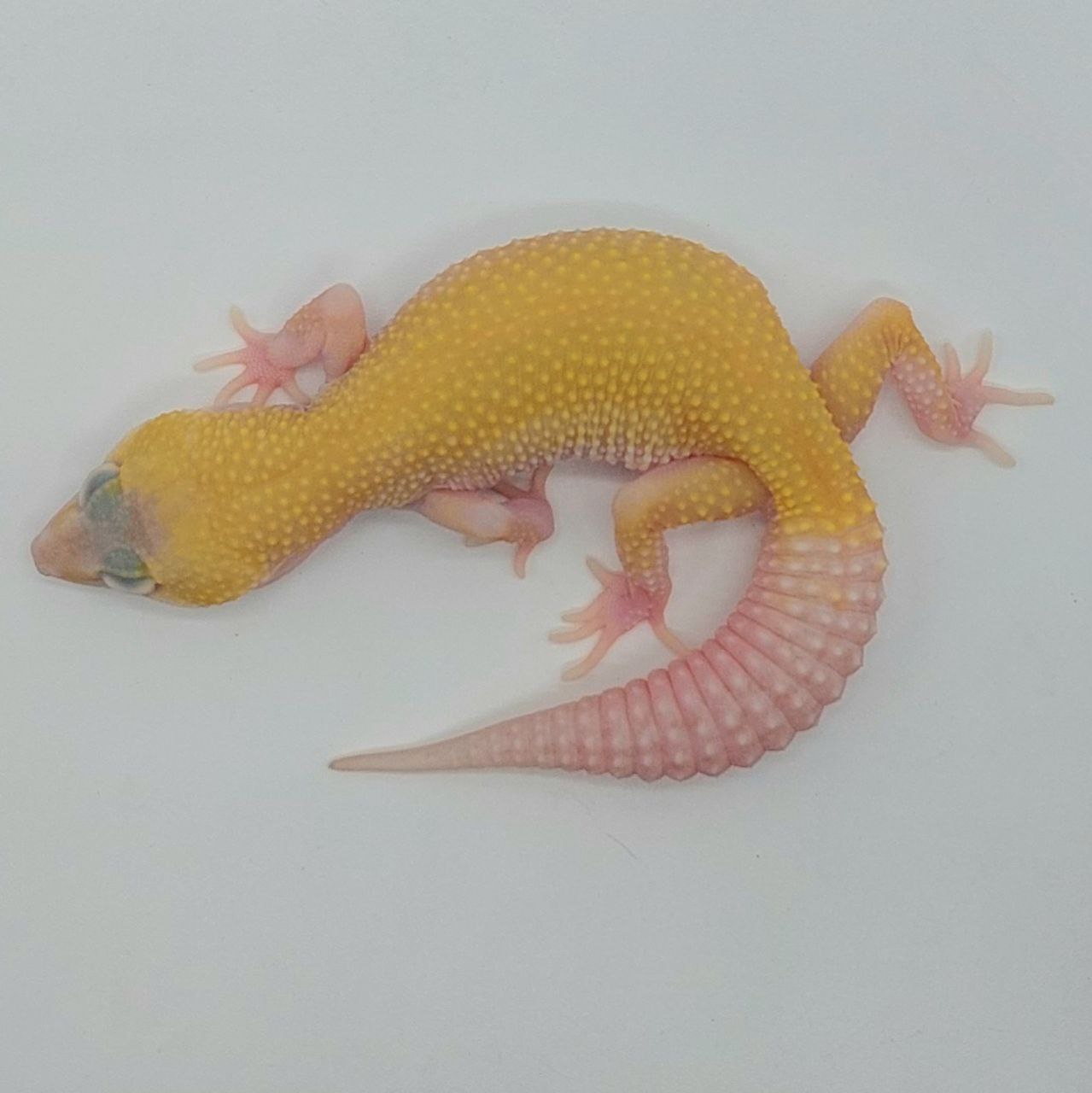 Este es un gecko extraordinario. Este ejemplar (subadulto) se caracteriza por manifestar una coloración amarilla suave, sin manchas (patternless), cola blanca y ojos rojos intensos de (rubí). Se obtiene al combinar las mutaciones recesivas Murphy Patternless y RAPTOR (Tremper Albino + Eclipse), resultando en un ejemplar de aspecto limpio y uniforme. A su vez posee el gen de fenotipo pied, que le hace tener el ocico y las extremidades despigmentadas.