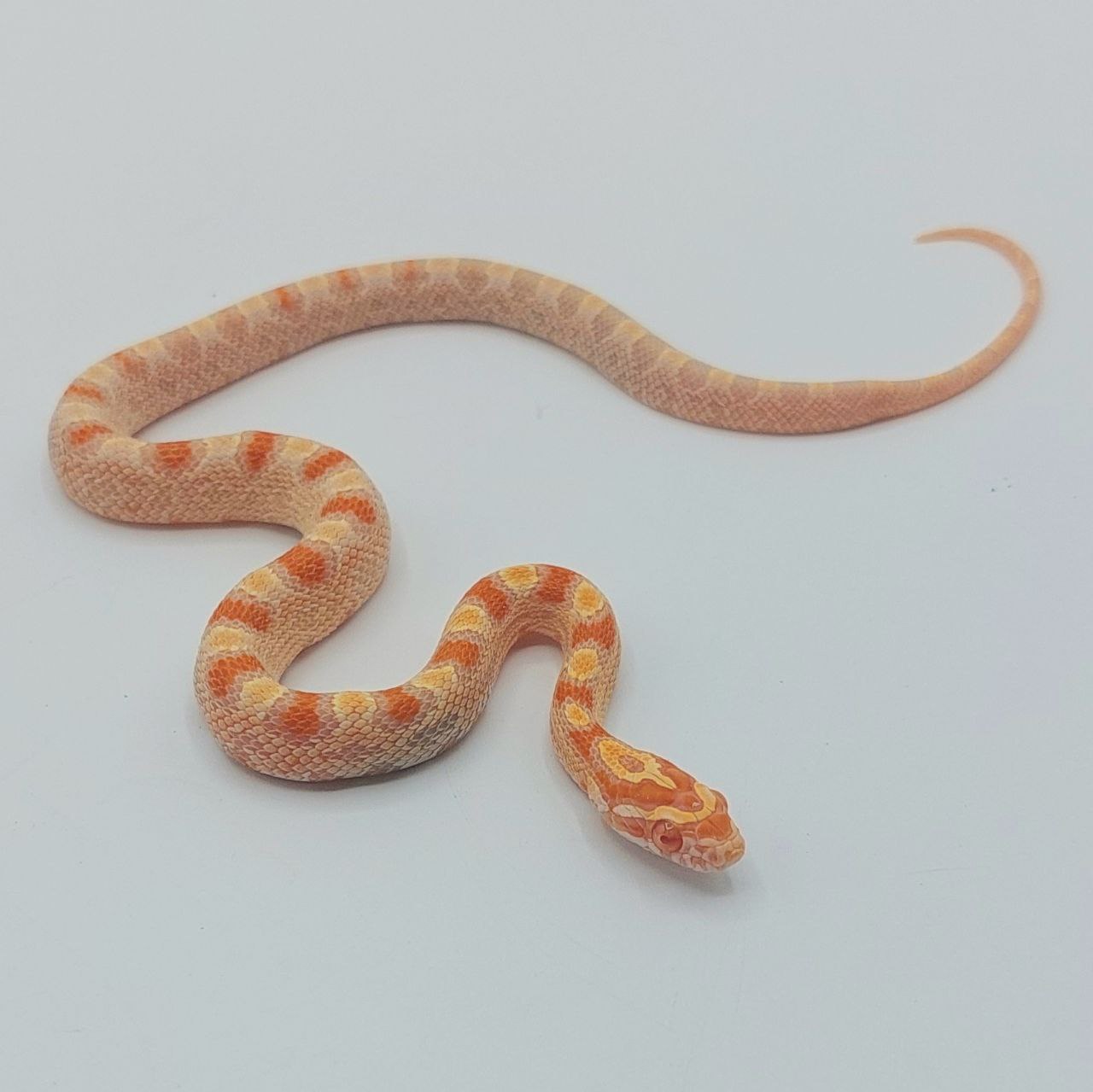 Este ejemplar posee una agradable coloración albina y escamas cefálicas reducidas.